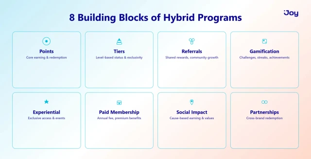 There are eight building blocks you can mix and match: points, tiers, referrals, gamification, experiential rewards, paid membership, social impact, and partnerships.